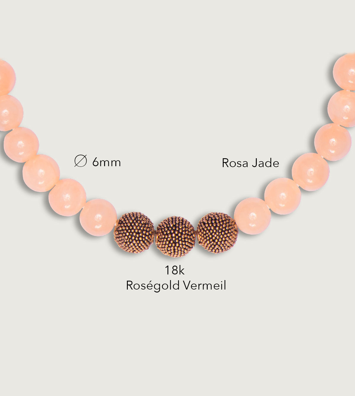 Die handgefertigten Jawan Beads aus 925er Sterlingsilber entstehen traditionell nach einer Jahrhunderte alten Silberschmiedekunst, bei der winzigste Kügelchen auf eine handgearbeitete Kugel aufgetragen werden. Traditionelles Handwerk und Hingabe verleihen den Beads so ihren einzigartigen Charakter. Gold hat auf Bali eine spirituelle Bedeutung, da es ein Geschenk aus dem Herzen der Erde ist. Daher haben wir die Beads passend zur Jade mit einer stylischen Vergoldung in 18 kt Roségold und edlem Matteffekt stilvoll abgerundet.