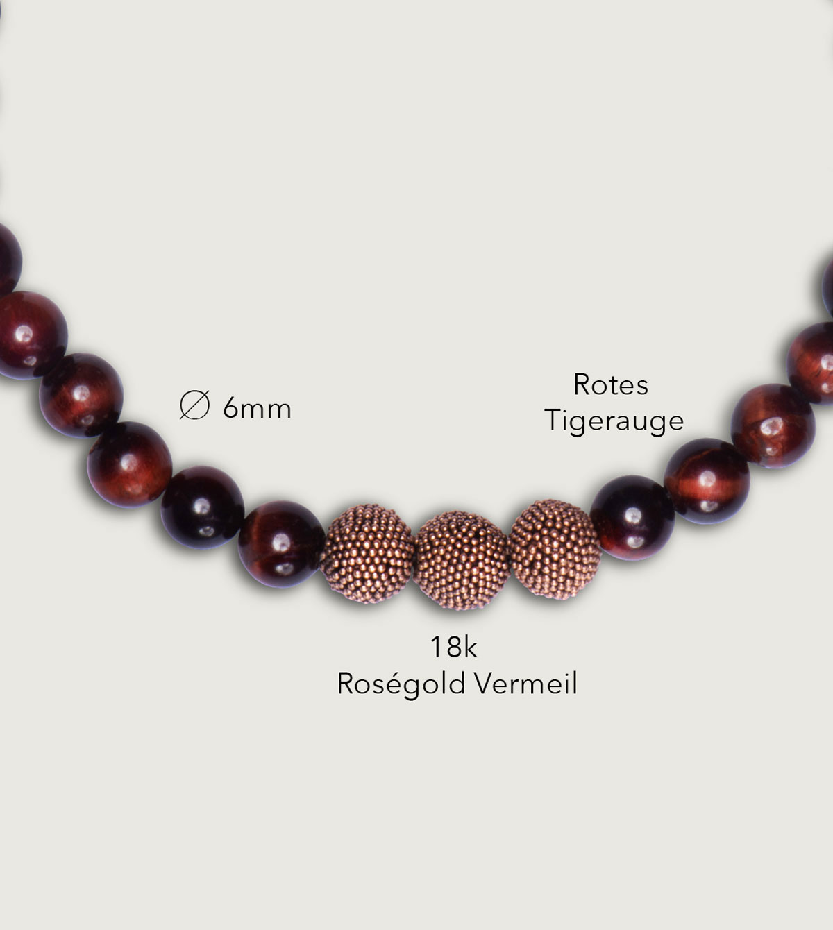 Verleihe Deinem Handgelenk das gewisse Etwas mit dieser perfekten Symbiose aus roten Tigerauge (6 mm) und Roségold vergoldeten & mattierten Silberperlen. Dieses Damenarmband schafft einen dezenten Blickfang an jedem Handgelenk.