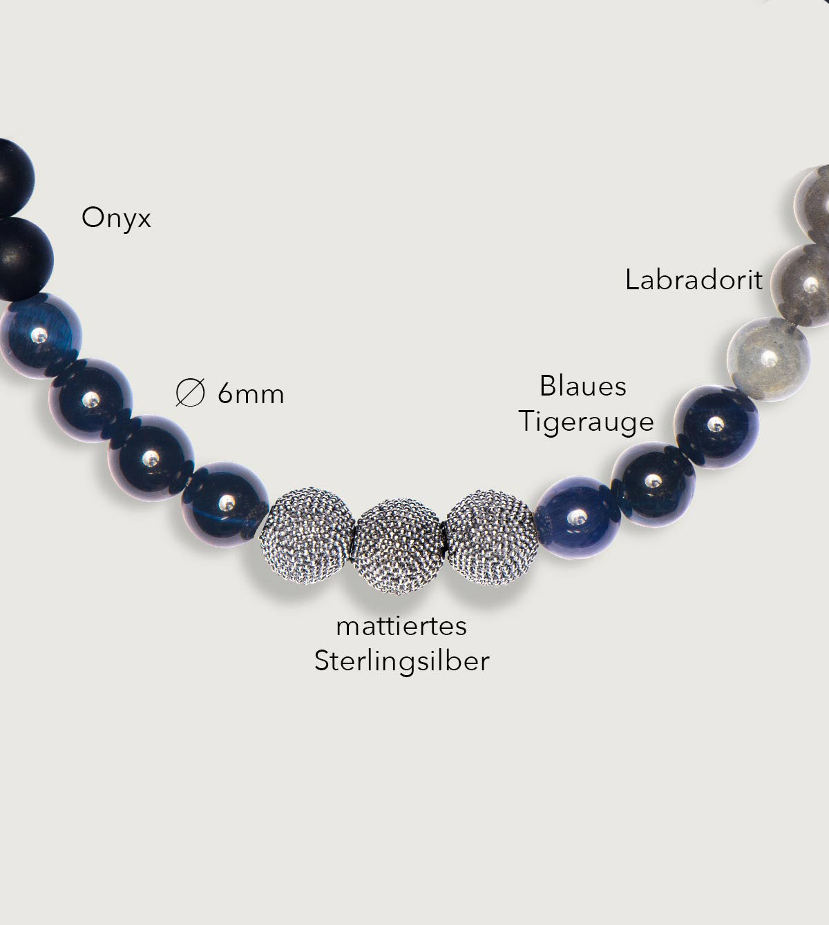 Blaues Tigerauge schimmert in tiefem Ozeanblau und wird unregelmäßig von helleren, blauen Schlieren durchzogen. Dadurch changiert die Farbwirkung je nach Lichteinfall und -intensität und erzeugt schimmernde Farbakzente. Das Farbbild wird harmonisch ergänzt durch Labradorit Perlen. Diese schimmern in Licht- bis Graphitgrau und zeigen ein Farbspiel in metallisch glänzenden Tönen mit vereinzelt blauen Einschlüssen. Dabei ist sein Glanz glas- bis seidenartig. Als besonderer Akzent wirkt dazu das matte und tiefe Schwarz der Onyx Beads.