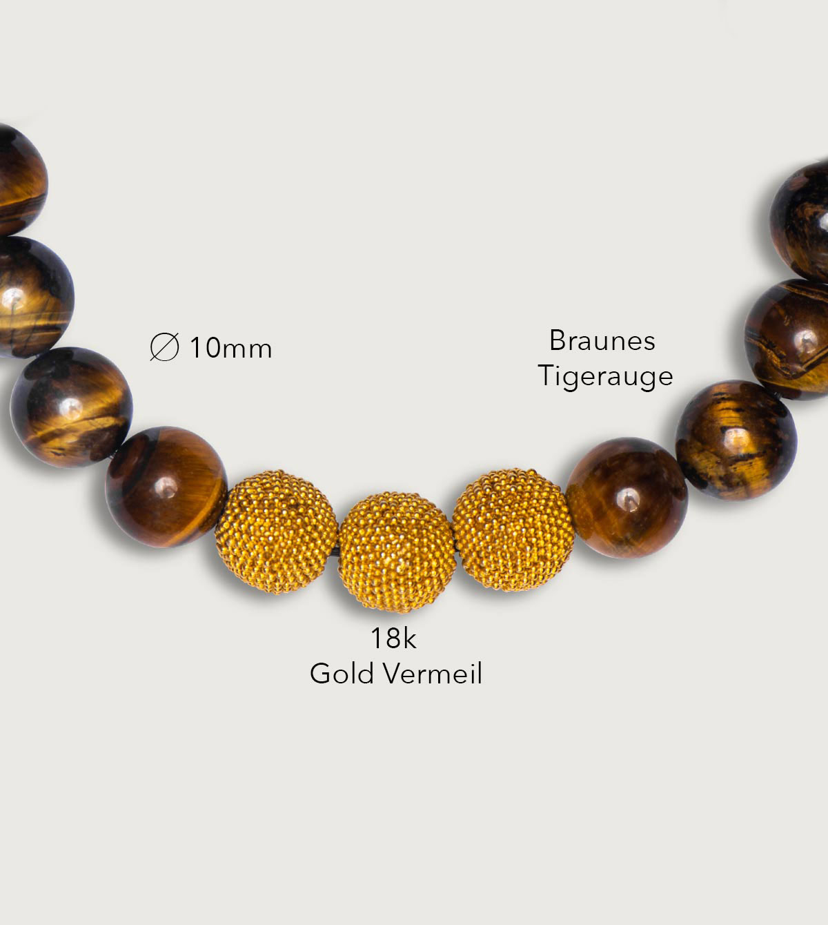 Die Jawan Beads aus 925er Sterlingsilber entstehen traditionell in reiner Handarbeit. Die althergebrachte Technik erfordert von den Silberschmieden viel Erfahrung beim Auftragen der winzigen Kügelchen, die eine filigrane Textur erzeugen. So verleihen Tradition und Hingabe diesen Beads ihren besonderen Charakter. Gold hat auf Bali als Geschenk aus dem Herzen der Erde eine spirituelle Bedeutung und zudem verleiht es Schmuck einen eleganten Look. Daher haben wir die Beads mit einer hochwertigen Vergoldung in 24 kt Gelbgold passend zum Tigerauge exklusiv abgerundet.