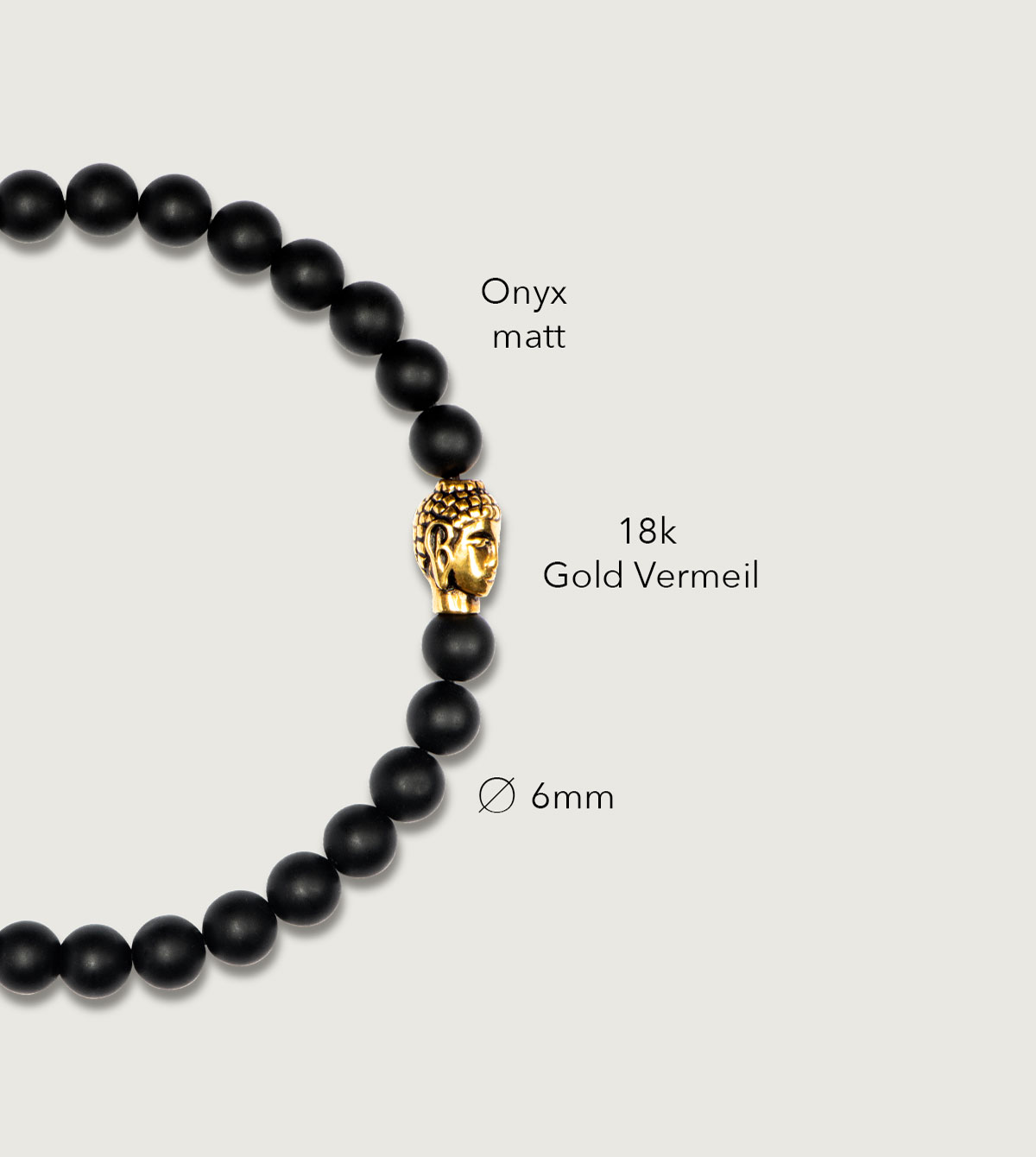 Ein edler Mix in Schwarz und Gold an diesem Armband aus mattierten 6 mm Onyx Beads wird mit dem vergoldetem Buddha ästhetisch abgerundet. Der Kontrast wirkt elegant und schafft eine exklusive Ausstrahlung an Deinem Handgelenk.