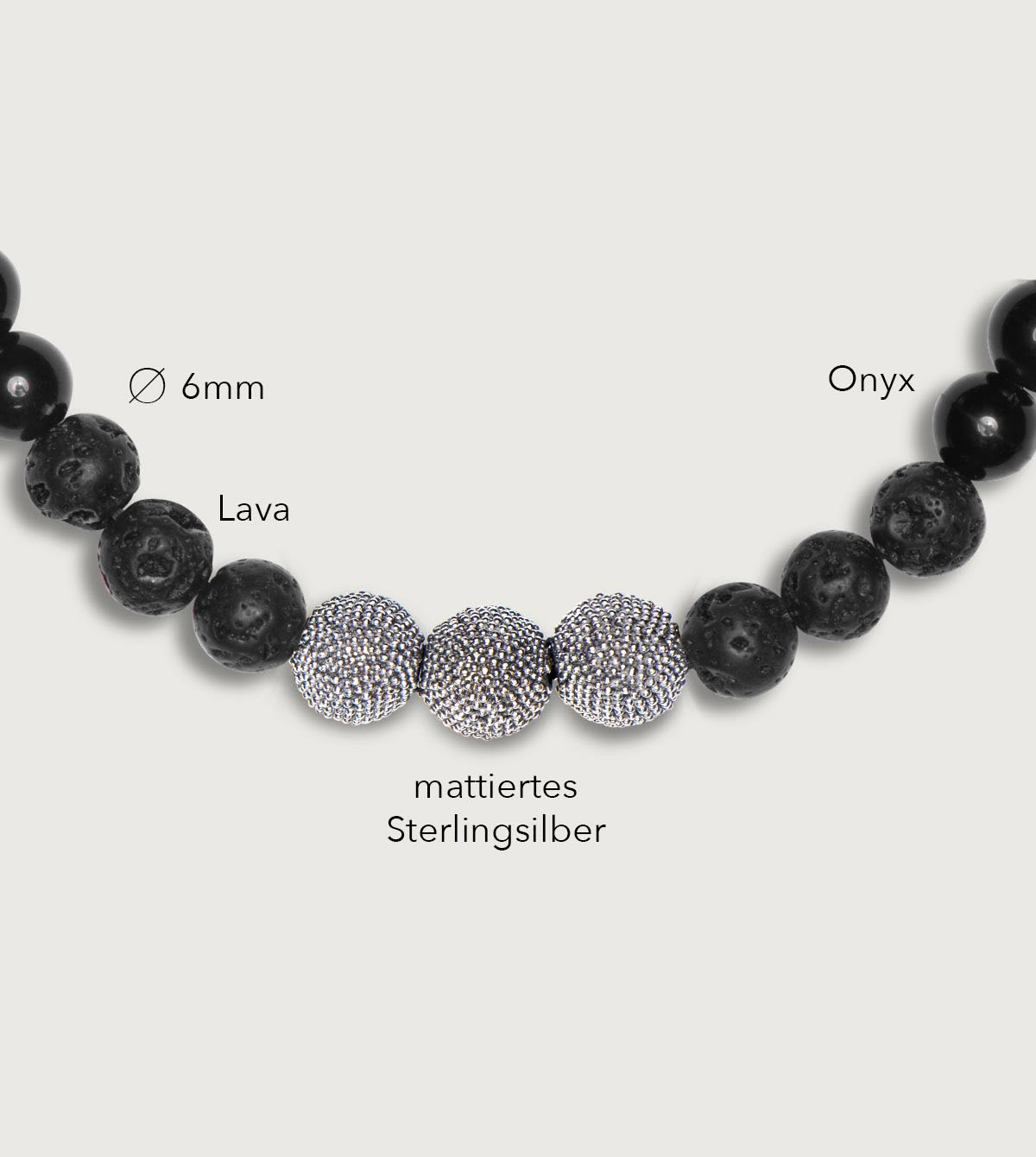 Minimalistisches Design für einen markanten Look schafft dieses Herrenarmband aus 6 mm Onyx (matt & glänzend) und Lava Beads, elegant abgerundet mit filigranen Silberperlen für einen legeren Blickfang am Handgelenk.