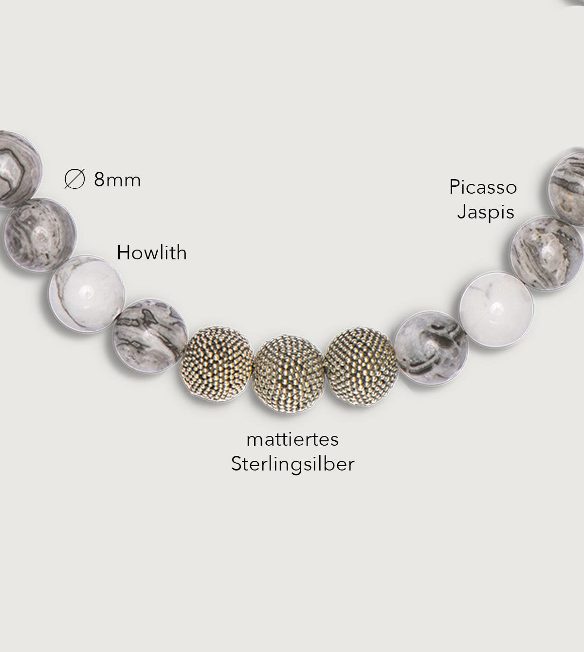 Der klassische Farbmix Weiß & Grau, aus Howlith und Picasso Jaspis in 8 mm, verleiht mit den handgefertigten Jawan Beads eine zeitlos-elegante Ausstrahlung.