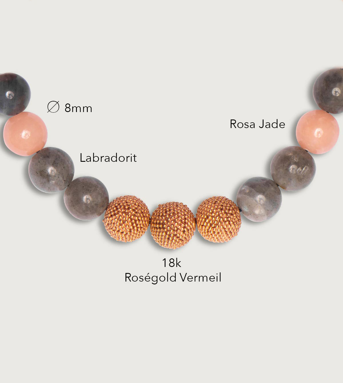 Schlichtes Design aus Grau & Rosa für ein elegantes Accessoire. Dein Armband für einen femininen Look aus Jade & Labradorit (8 mm) abgerundet mit Roségold vergoldeten Silberperlen für Deinen ganz persönlichen Look und einen eleganten Alltag.