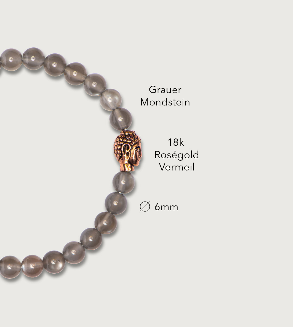 18k Roségold Vermeil Perlen & Buddha mit Mondstein Grau & Rosa Ø 6 & 8mm