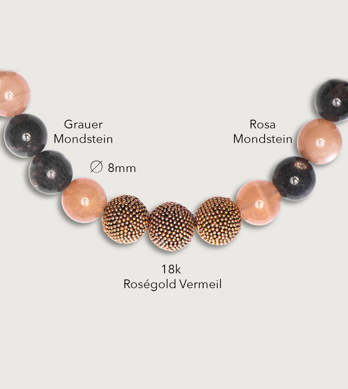 Mondstein hat durch seinen weichen, mondähnlichen Schimmer eine grazile Wirkung. Das dezente Schiefergrau verschmilzt harmonisch mit dem femininen Rosa. Dabei ist sein Farbspiel leicht glasig, was dem Armband eine ästhetische Ausstrahlung verleiht. Im Hinduismus herrscht die Vorstellung, es handele sich beim Mondstein um verhärtete Mondstrahlen.