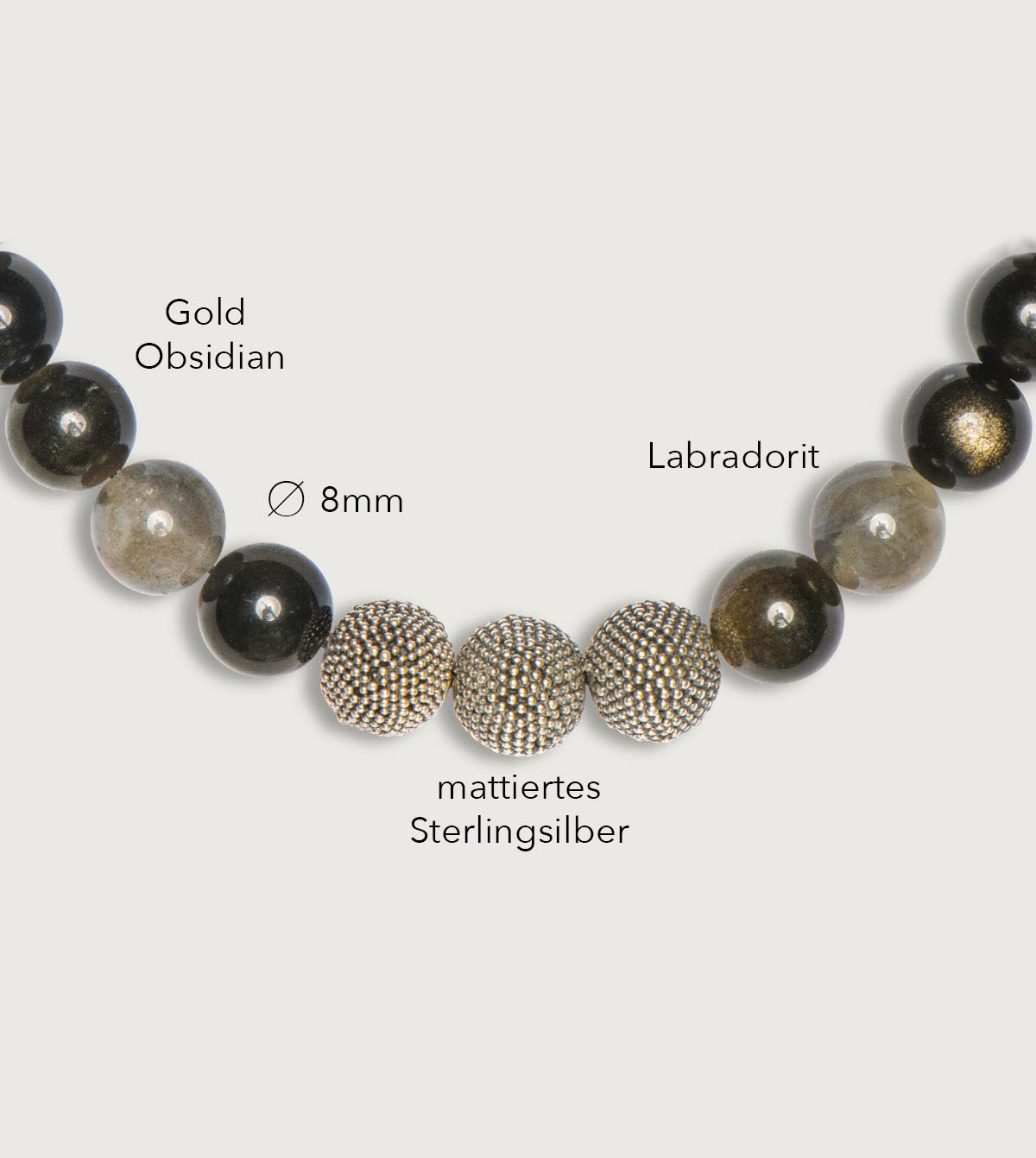 Labradorit changiert von Licht- bis Graphitgrau und zeigt so ein Farbenspiel in metallisch glänzenden Tönen. Sein Glanz ist glas- bis seidenartig und vereinzelt blauen Einschlüssen verleihen ihm eine eindrucksvolle Charakteristik. Perfekt ergänzend dazu wirkt der Goldobsidian mit seinem fast schwarzen Grundton, der markant von moosgrünen und goldbraunen Flecken überzogen wird, die je nach Blickwinkel unterschiedlich intensiv schimmern.