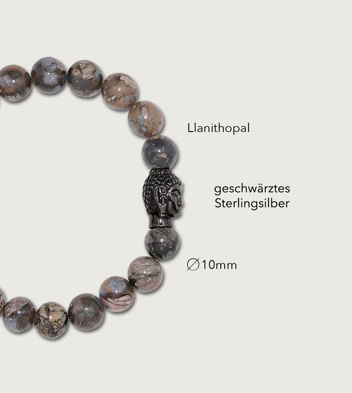 Llanitopal ist auffallend durch sein geflecktes Farbspiel an Braun- und Blautönen sowie leicht rosanen Nuancen, die zusammen ein strahlendes Farbbild erschaffen. Seine einzigartige Farbkomposition,, dass alle Farbtöne der Natur aufweisen kann, fasziniert und wirkt wohltuend auf Seele & Geist. Zusammen mit dem geschwärzten Buddha bilden seine farbintensiven Perlen in 10 mm ein unglaublich schönes Armband, dessen Kontrast elegant wirkt und Deinem Look eine ganz persönliche Note verleiht