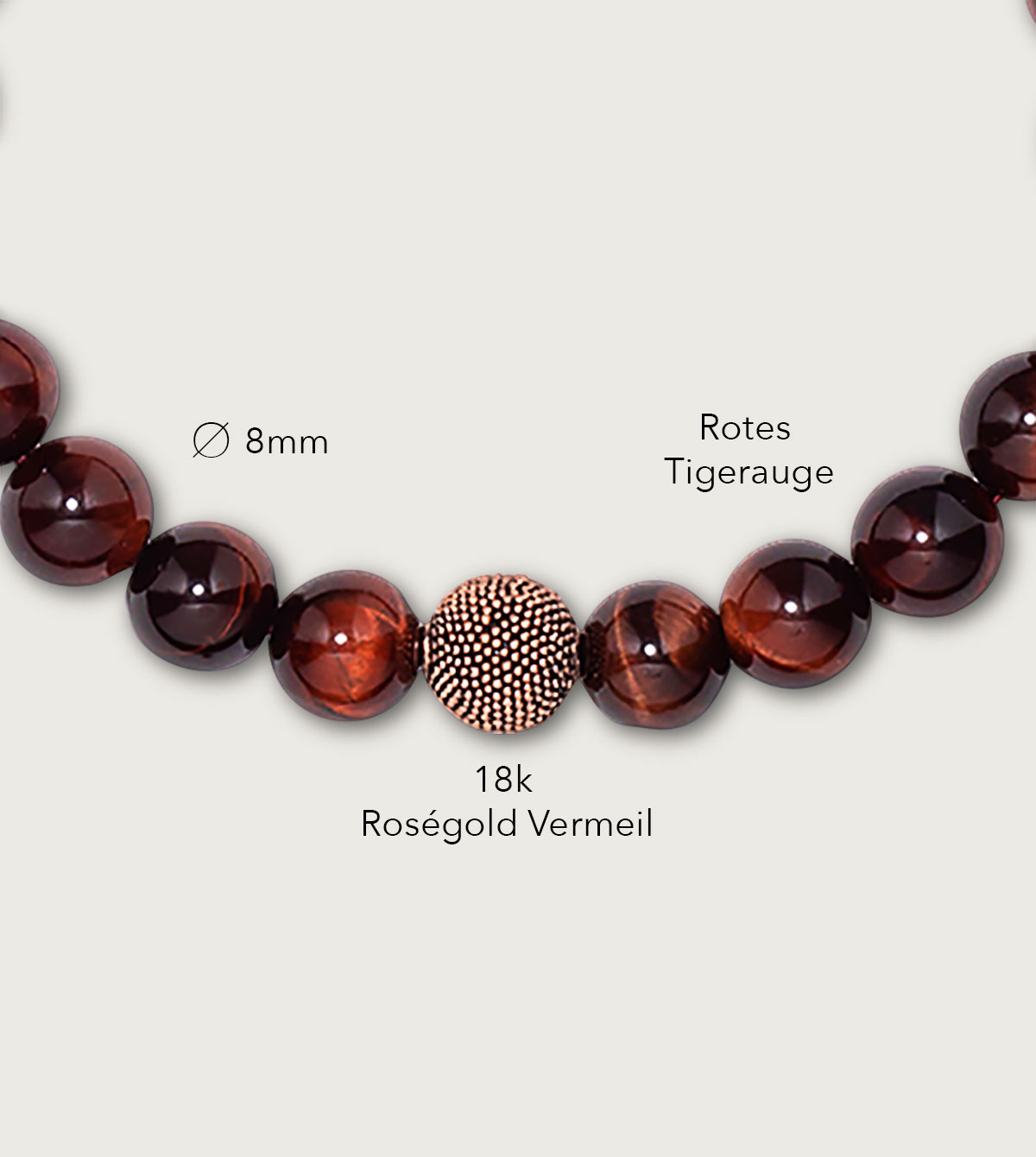 Verleih Deinem Handgelenk Stil & Eleganz mit unserem Armband aus rotem Tigerauge und einer handgefertigten & Silberperle rosé vergoldet. Die einzigartige Maserung verleihen dem Armband einen unverwechselbaren Charakter. Die tiefen, lehmartigen Rottöne, durchzogen von dunkleren Streifen, wirken verspielt und elegant zugleich. Um das Tigerauge perfekt in Szene zu setzen, bildet die Rosé vergoldete Silberperle das dezente Highlight. Ein einfaches und dennoch kraftvolles Armband, mit dem Du Deinem persönlichen Look spielend leicht Ausdruck verleihen kannst.