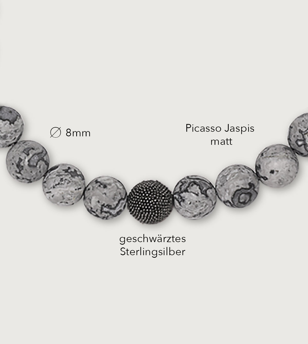 Herren Armband aus mattem Picasso Jaspis & geschwärzter Silberperle ist ein Juwel, das Deinen Stil dezent unterstreicht. Beim Picasso Jaspis sieht keine Perle aus wie die andere, er wird von hell- bis dunkelgrauen, teils weißen Schlieren durchzogen. Das Armband ist perfekt, um Deinem Alltagsoutfit einen Hauch von legerer Eleganz zu verleihen. Mit seiner zeitlosen Schönheit und besonderen Qualität ist es ein unverzichtbares Accessoire für einen stilvollen Alltag.